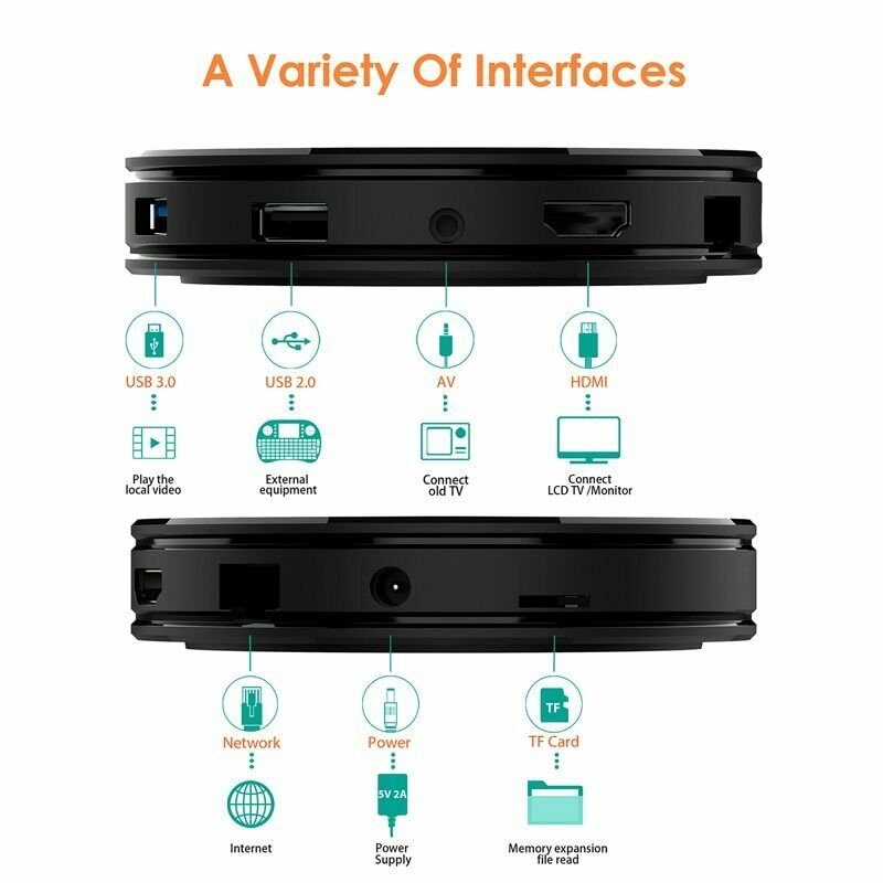 Alimenté par un processeur Quad-Core 64 bits RK3318 haute performance. Il dispose également de HD 2.0, USB3.0 et d’un GPU Penta-Core Mali-450.